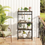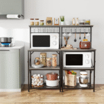 Beyond a kitchen bakers rack, it functions as a coffee stand, microwave cart, flower rack, printer stand, or balcony plant stand. Its sleek industrial vibe fits kitchens, living rooms, bathrooms, and restaurant kitchens.