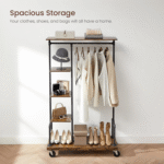 Beyond clothing, the rack features 3 side shelves, 1 top shelf, and 1 bottom shelf—perfect for storing purses, shoes, bags, boxes, and other accessories.